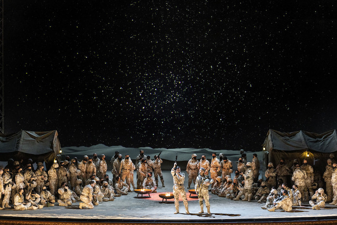 Disegna così, Mario Martone, con l’essenziale e misurato ausilio delle scene di Margherita Palli – paesaggio semilunare e pallido fatto di tende e di rovine romane, di sabbia e cielo, pietra e stelle, case di fango e lamiera in cui possono incontrarsi, o respingersi, cuori e mani – un confine, una frontiera, presidiato dalle truppe di un esercito occidentale occupante: l’ambiente orientale, lontano da casa, da Venezia, dall’Italia e dall’Europa – forse la Cipro del libretto, tuttora terra divisa ed estrema, oppure no, forse, chissà, una dei tanti limiti periferici del nostro universo, reale e metaforico – più facilmente materializza fantasmi osceni e dubbi taciuti, anima fate morgane di baluginii lontani e foschi che di sicuro son più facili occorrere in tali frangenti: è, il confine, luogo duplice e ambiguo per definizione, a volte ponte per incontrare l’altro nell’amore, talora insormontabile barriera per respingerlo, ossessione del definito da contrapporre all’eternamente vago e indefinito, come un sogno, incubo blando, sogno che rivela un fatto oppure che può dar forma di prova ad altro indizio.