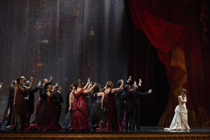 Così, dal primo apparire, esanime durante quello che si direbbe il suo funerale, sotto l’incessante pioggia – sotto l’incessante pianto – fra sei personaggi in frac e ombrello, Nino Machaidze presta se stessa al ripercorrere tutta la storia di Violetta, racconto scandaloso di redenzione, d’amore e di morte, che il regista ha costruito come lungo flashback rivissuto attraverso il filtro di un ricordo ovattato che stinge i colori e ammorbidisce i contorni, fino a far morire Violetta insieme alla scena mentre l’orchestra suona le ultime note, implodere colori e luci per lasciare il posto alla visione di ciò che sta sotto, la grezza architettura del palcoscenico che, come scheletro umano, permetteva alla scena stessa di stare in piedi e vivere.
