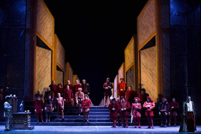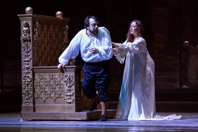 Ottima, come sempre, l’Orchestra del San Carlo, segue fedelmente le scelte del direttore e anche il Coro, diretto dal Maestro Marco Faelli, non sbaglia nemmeno un attacco. Buon protagonista nel ruolo eponimo, il baritono George Petean ha una voce, pur se con qualche carenza nelle note acute, abbastanza corretta, morbida e dal bel timbro, pur senza esser dotata di precipua personalità che la renderebbe riconoscibile: convince, tutto sommato, la sua interpretazione, dalla buona dizione, pur se è da mettere in conto qualche limite nell’espressione.