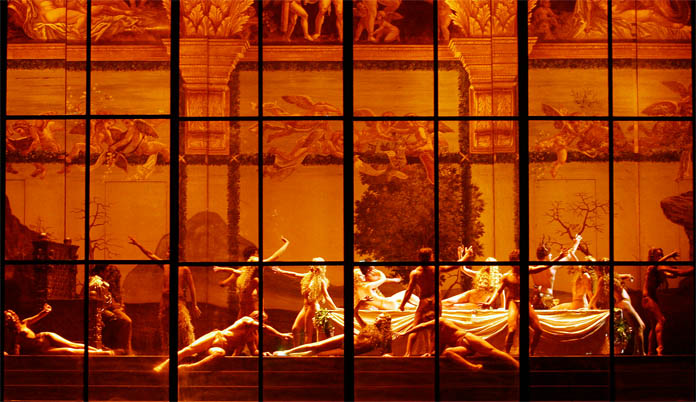 Posta in questi termini, la grande scena del primo atto, vista attraverso una gigantesca gabbia di vetri solo parzialmente trasparenti e leggermente deformanti, attualizzazione visiva della deformazione del ricordo, oltre che metafora stessa dell’implacabilità della maledizione, realizza perfettamente, anche musicalmente, l’intenzione verdiana: perché Rigoletto è opera di lacerazioni e conflitti e ferite, e anche il suo sistema drammatico si basa su feroci e contrapposte opposizioni; nella prima scena Verdi ha impiegato con sapienza la “musica in scena”, tipico “effetto speciale” del teatro d’opera con cui si contrappongono più motivi musicali, prodotti da voci o strumenti in scena o dietro le quinte, oltre ai temi musicali eseguiti dall’orchestra vera e propria. Così, mentre l’avvio viene affidato, in questo caso, a una banda che attacca una musica da ballo in La bemolle maggiore, in forte contrasto con il conciso e drammatico preludio che ha aperto l’opera, una piccola orchestra d’archi, composta da due violini, una viola e un contrabbasso, accompagna le danze.