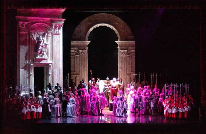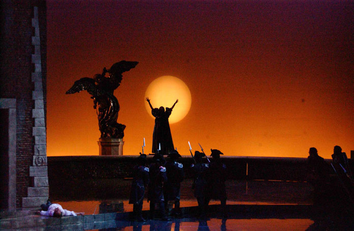 Molto efficaci alcune trovate sceniche, tra tutte sicuramente l’entrata di Scarpia in chiesa grazie alla quale si avverte financo l’urto tellurico del suo ingresso, e la forza virile del suo potere prepotente. Di tutto lo spettacolo la parte un po’ meno efficace visivamente resta il terzo atto. Scenicamente infatti si scolla dai riferimenti pittorici di prima e si avverte la polvere degli anni negli effetti luminosi di un cielo gigante che campeggia sulla scena commentandola, ma che sicuramente sono da aggiornare, ora come ora infatti risultano più banali e scontati di tredici anni fa probabilmente. Peccato poi per la molto discutibile resa del sacrificio catartico di Tosca nel finale. La diva infatti non solo non si getta da Castel San’Angelo ma decide, dopo un primo ripensamento, di gettarsi sulle baionette dei fucili puntati contro di lei e di finire la sua vita abbracciata al bel Mario. L’esito non risulta catartico, ma resta un goffo modo di disattendere una trama già nota, complici sicuramente la scarsa convinzione scenica degli attanti in quel momento. Spettacolo comunque bello e da conoscere.