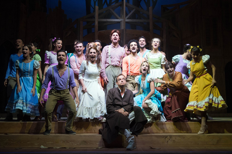 Lo spettacolo inizia proprio con la famosissima canzone “Aggiungi un posto a tavola” con i giovani parrocchiani di una chiesa di piccolo paese di montagna, diretti dal parroco del paese appunto Don Silvestro, un bravissimo Gianluca Guidi, un sacerdote scanzonato, ironico e un po’ fragile forse, visto che nel corso della storia ha un tentennamento sulla sua vocazione sentendo un po’ il peso della solitudine derivata dal voto di castità ma determinato a fare qualsiasi cosa pur di salvare la comunità del suo piccolo paesino dal preannunciato secondo diluvio universale che la “Voce di Lassù” interpretata da uno straordinario Enzo Garinei (la cui postazione in galleria sarà svelata a fine spettacolo sotto un applauso lunghissimo all’attore e alla sua straordinaria carriera oltre a festeggiarlo per il suo talento e la sua voglia di stare ancora sul palco nonostante la sua veneranda età di 92 anni), che intima al suo curato di costruire un’arca per salvare esclusivamente gli uomini e le donne del paese per poter ripulire il mondo da tutti gli uomini che ormai sanno solo essere malvagi e distruttivi sulla Terra. Malgrado l’operazione sia fortemente ostacolata dall’avidità del Sindaco Crispino, interpretato da un ironico quando scatenato Marco Simeoli, che nella precedente edizione aveva interpretato Toto, Don Silvestro riuscirà nel suo intento. L’arrivo in paese di Consolazione (Emy Bergamo al suo terzo ruolo nelle commedie di Garinei e Giovannini) creerà scompiglio tra gli uomini ma che sarà conquistata dal ritrovato “vigore” del sempliciotto del paese Toto (Piero Di Blasio) che la sposerà per portarla sull’Arca insieme a tutti i suoi amici. Giunti al momento di salire sull’arca, la popolazione del paesino si farà convincere, con il suo Sindaco e la moglie Ortensia (Francesca Nunzi) dalla Chiesa interpretata da un fantomatico Cardinale a considerare il prete pazzo e ad abbandonare l’Arca. Don Silvestro si ritroverà solo con Clementina (Beatrice Amera) da sempre innamorata di lui e con la quale canta due splendide canzoni “Peccato che sia peccato “ e “Notte per non dormire”. Tentato per un attimo a viversi il sentimento d’amore con Clementina, Don Silvestro sull’Arca, di fronte all’abbandono dei suoi parrocchiani, ritrova la forza della sua vocazione e confessa a Dio l’intenzione di ritornare sulla Terra e di bloccare il Diluvio perché “Non si può non amare anche chi non è come noi, perché è questo l’Amore che ci hai insegnato” ! Lo spettacolo si conclude con una grande tavolata con Don Silvestro circondato da tutti i suoi amici del paese che festeggiano l’arrivo di una colomba che si poggia sull’unica sedia vuota, sotto l’applauso infinito del pubblico, ed un emozionatissimo Gianluca Guidi che proprio in questa scena, almeno è stata la sensazione di chi scrive, chiude gli occhi per dedicare questi applausi al suo amatissimo padre che quest’anno ha compiuto 80 anni ma che rimane nei pensieri del pubblico che lo ha amato proprio nelle vesti del prelato dello spettacolo e in tanti altri ruoli che il teatro e il cinema gli ha affidato e che lui ne ha reso sempre dei grandissimi capolavori.