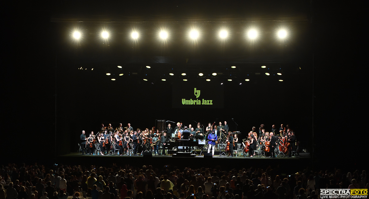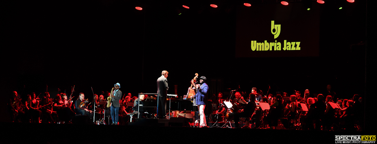 L’emozione del pubblico è evidente manifestata con il lunghissimo applauso che dedica a Gregory Porter al suo arrivo in Arena. Da tempo beniamino del pubblico di Umbria Jazz, ospite sia nell’edizione invernale ad Orvieto che a Perugia, per la critica è una delle voci più belle del panorama jazzistico internazionale. Accompagnato dai 65 elementi dell’Umbria Jazz Orchestra (già protagonisti della serata omaggio a Quincy Jones) diretta per l’occasione da Vince Mendoza, che ha scritto gli arrangiamenti dei brani di Nat King Cole al quale Porter ha dedicato il suo ultimo disco “Nat King Cole and me” registrato con la London Studio Orchestra diretta dallo stesso Mendoza, ha letteramente conquistato il cuore del pubblico presente con la sua voce potente e melodica e le sue radici ben piantate nelle migliori tradizioni del jazz e della musica nera. Umbria Jazz è stato tra i primi a riconoscere il talento del cantante californiano, facendolo esordire nella 20esima edizione di Umbria Jazz Winter come resident artist, ospitandolo, negli ultimi 5 anni, diverse volte a Perugia, come l’anno in cui fu ospite vocale della Lincoln Jazz Orchestra diretta da Wynton Marsalis. Il suo modo di cantare è spettacolare, come la sua emozione, vera, nel ricordare in più di un’occasione l’importanza che ha avuto per lui la musica di Cole, ascoltata sin dai primi anni della sua giovinezza. Il concerto inizia subito con “Mona Lisa”, “But Beautiful” e “Nature Boy”, con le quali questo “gigante buono” della musica (è altissimo e di corporatura decisamente massiccia) da prova non solo della potenza e della bellezza della sua voce ma anche della capacità di reinterpretare questi grandi classici della musica jazz afroamericana con uno stile tutto suo, grazie anche agli arrangiamenti splendidi di Mendoza. Con “Quizas, quizas, quizas”, “When love was king” , “love” e la bellissima “I wonder who my daddy is” sulla quale lo stesso Porter si emoziona ricordando la figura di un padre assente che ha in parte condizionato la sua vita, il pubblico si emoziona e applaude senza soste. Con la bellissima interpretazione di “Smile” riesce a fermare anche una fastidiosa pioggia che aveva costretto parte del pubblico ad abbandonare il concerto e lasciare la zona dell’Arena per potersi ripare, ripagando poi il pubblico, che impavido sotto la pioggia, aveva deciso di restare in Arena per continuare ad applaudirlo con due bellissime canzoni del suo precedente album “Liquid Spirit” come “Hey Laura” dolcissima canzone d’amore, e “Liquid Spirit” , invitando, nel bis, sotto palco tutti i presenti, a cantare e ballare, la versione gospel di “Free” con il quale conquista definitivamente il cuore e l’anima di un pubblico innamoratissimo della sua voce e della sua musica.