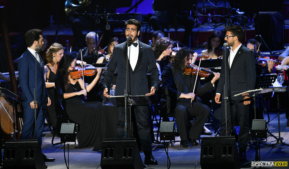 Il concerto è iniziato con l’omaggio ai brani classici della lirica e dell’opera come “La forza del destino” “Nessun Dorma” , “L’elisir d’amore Una furtiva lagrima”,” E lucevan le stelle”, alternandoli a brani della musica internazionale come “My Way” interpretati da Gianluca e Piero, di musical americani come “Maria” o “Tonight”(West Side Story) e omaggi alla musica della tradizione classica napoletana come “Torna a Surriento” “O paese d’o sole”, ” ‘O surdato nnammurato”, “O sole mio” e ad alcune composizioni in spagnolo portate al successo da José Carreras come “En Aranjuez con tu amor” o “no puede ser” grandissimo successo di Placido Domingo, per concludere poi, per un richiestissimo bis, la loro canzone “grande Amore” con tutto il pubblico in piedi in Arena a testimonianza di quanto il bel canto e il loro modo elegante di porsi sia riconosciuto ed apprezzato.