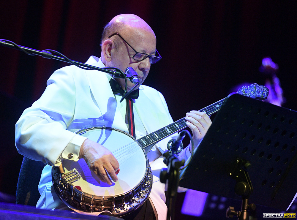 Una grandissima serata d’atmosfera jazzistica in puro stile New Orleans quella di giovedì 25 maggio alla sala Petrassi dell’Auditorium Parco della Musica di Roma. Non solo per la band, gli Hot Stompers di Gennaro D’Apote, che lo accompagnava sul palco, elegantissimi dietro ai loro leggii ricoperti da grandi pannelli bianchi con il logo della band ben in evidenza che fa tanto Big Band degli anni ’50, ma per il carisma di uno dei più grandi jazzisti italiani di tutti i tempi: Lino Patruno.
