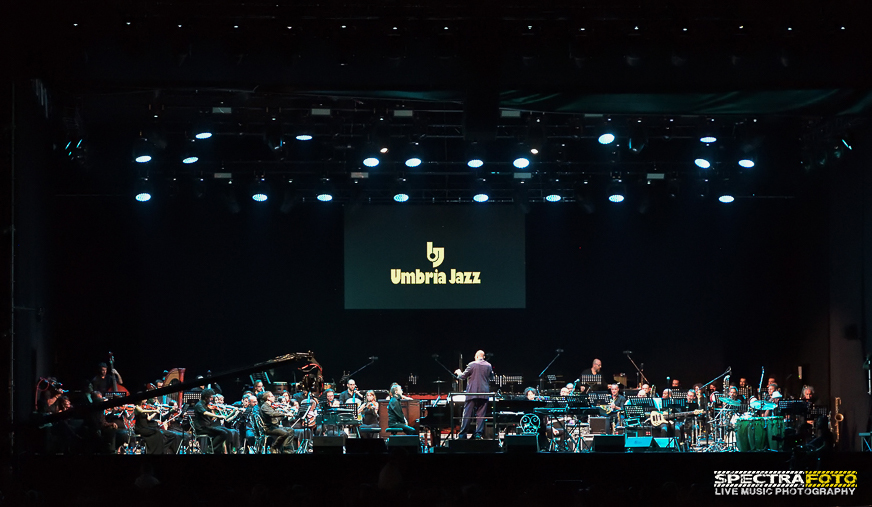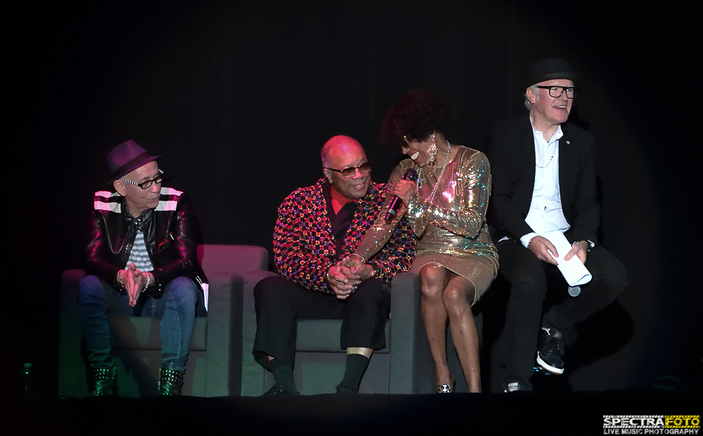 Il pubblico dell’Arena Santa Giuliana ha accolto, con uno straordinario sold out, colui che è stato produttore, arrangiatore, direttore d’orchestra, musicista, compositore con un serata/concerto che ha visto avvicendarsi sul palco nomi del firmamento musicale internazionale come Dee Dee Bridgewater, Noa, Take Six, Patti Austin, Ivan Lins, Alfredo Rodrigues e Pedrito Martinez, la Umbria Jazz Orchestra diretta da John Clayton, Nathan East (bassista di Stevie Wonder, Eric Clapton, Elton John) e Harvey Mason. Il tutto diretto, magistralmente, da Nanni Zedda, anch’egli musicista oltre che organizzatore, che ha voluto dare un omaggio personale a Jones con un bellissimo brano cantato insieme a Ivan Lins.