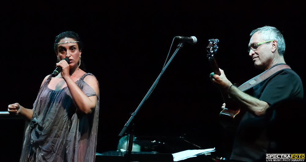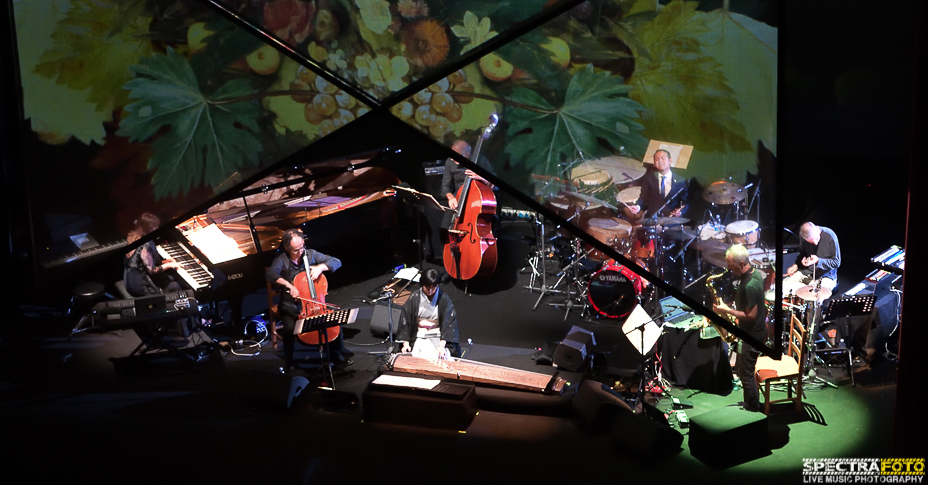 La prima giornata di concerti si è aperta con un concerto in anteprima nazionale, il nuovo progetto della pianista Rita Marcotulli “Caravaggianti” prodotto da Tadaam che si esibita al Teatro Morlacchi alle 17 insieme ad una band di eccellenti musicisti di diverse nazionalità: la giapponese Mieko Miyazaki, il messicano Israel Varela, il norvegese Tore Brunborg, il franco-algerino Michel Benita, gli italiani Michele Rabbio e Marco Decimo, sui testi di Stefano Benni e la regia e visual designer di Karmachina. Il teatro si trasforma in un palco dove musica, immagini e parole concorrono a creare un’atmosfera unica nel suo genere, un vero e proprio lavoro multimediale che fonde la musica jazz con la musica classica, quella contemporanea con quella elettronica. I musicisti sul palco sono parte gli uni degli altri, ogni nota di ogni strumento sembra parte integrante di un progetto che è una vera opera d’arte dove la musica si fonde con le parole che vengono recitate da una voce fuori campo e con le immagini che scorrono su una sorta di tela calata dall’alto e che copre in parte il gruppo stesso sul palco. Le immagini proiettate evocano visioni e suggestioni legati al mondo e ai capolavori del Caravaggio e il pubblico ascolta in religioso silenzio le note del progetto, emozionandosi profondamente. Come spiega la stessa Marcotulli “Il fascino dei dettagli, l’alternanza tra il buio e la luce dei quadri del Caravaggio mi hanno ispirata, perché l’arte di tale Artista rapiscono la mente e la portano lontano , nei pensieri profondi di ciascuno di noi. Caravaggianti è un viaggio evocativo, tra chiaro e scuro, ombre e luci, alla ricerca non del senso delle opere, ma proprio di lui, del pittore, del Caravaggio”. Il talento pianistico della Marcotulli, unitamente alle note magistralmente prodotte dal talento artistico di tutti i musicisti sul palco, le emozioni suscitate dalla voce di Israel Varela, e soprattutto la magia delle note del Koto, antico strumento a corde giapponese capace di trasportare il pubblico con le sue melodie che evocano l’antica tradizione musicale orientale, hanno dato origine a quello che si può definire un autentico capolavoro musicale.