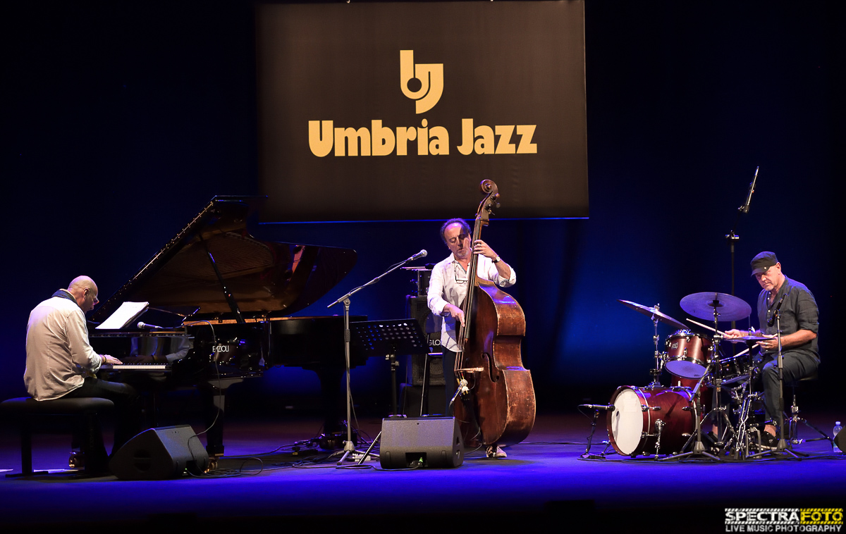 Il primo al Teatro Morlacchi sabato 21 luglio con il concerto di Italian Trio composto da tre indiscussi assi del jazz italiano: Dado Moroni al piano, Rosario Bonaccorso al contrabbasso e Roberto Gatto alla batteria. Se volessi solo citare alcune delle collaborazioni o della carriera di questi tre mostri sacri della musica non basterebbe lo spazio previsto per l’intero articolo. Tutti e tre hanno una carriera formidabile e uno stile assolutamente strepitoso, tutti non solo fantastici musicisti ma anche ottimi compositori, avendo scritto brani di un’impareggiabile bellezza. Il concerto presenta brani, eseguiti in modo assolutamente emozionante da loro stessi composti, dando uguale spazio ad ognuno di loro, creando una vera e propria sinergia sul palco tra i tre musicisti. Ho avuto modo spesso di ascoltare la loro musica con diversi progetti e formazioni ma mai tutti e tre insieme e devo dire che il risultato è assolutamente sorprendente. Roberto Gatto scatenatissimo alla batteria, Rosario Bonaccorso sempre sorridente riesce a dare ancora più energia al gruppo grazie ai suoi virtuosismi al contrabbasso, e Dado Moroni, nella sua solita veste di gentleman inglese, oltre a presentare i brani con il suo solito fairplay e la sua simpatia, riesce a dare ai brani una magia nuova grazie al suo talento pianistico. Il concerto si conclude con un omaggio a Bruno Martino con “Cos’hai trovato in lui”, seguito da un omaggio ad uno dei brani di Quincy Jones, e nel bis una bellissima composizione di Rosario Bonaccorso dedicata al periodo jazz definito “be bop” del quale si ritiene innamoratissimo intitolata “Un poco Bop”.