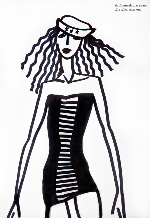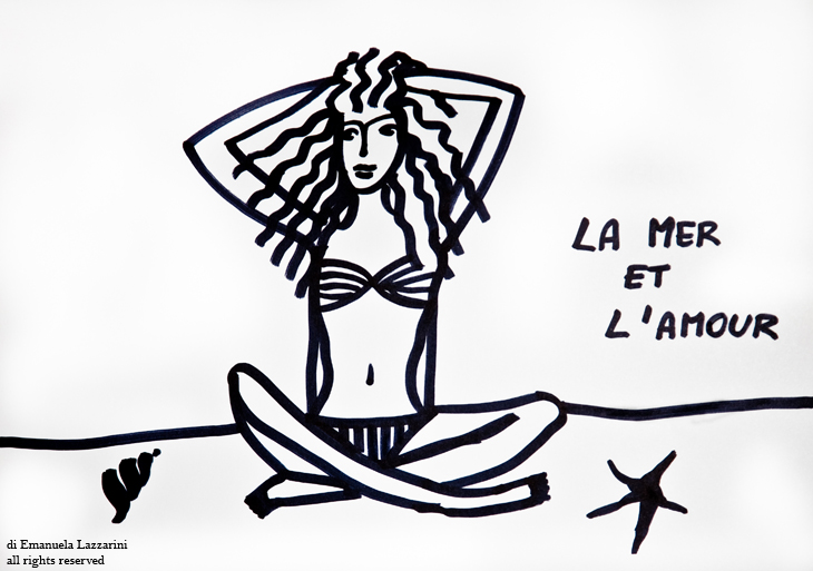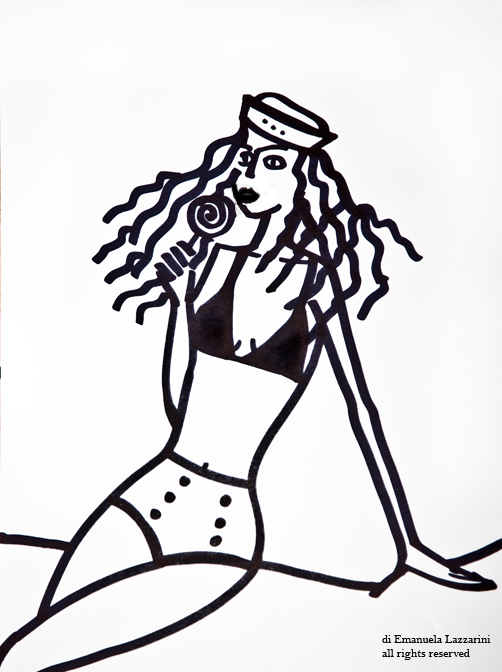 Il mare è la cornice immaginaria che fa da sfondo a queste illustrazioni. Il bianco e nero e l’impatto grafico che ne risulta, contrasta con la suggestione romantica e sognante suggerita dalle pose che richiamano gli anni 50 e le pin-up. Linee semplici che tendono a sintetizzare la fantasia e al tempo stesso a liberarla.
