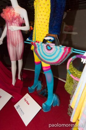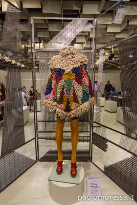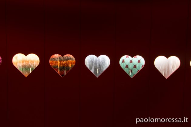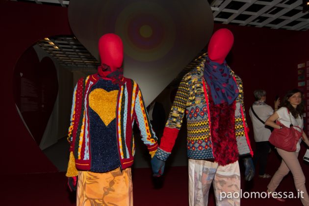 LOVE invece è il tema e titolo dello Spazio Ricerca di questa edizione. Amore all-over, inteso come emozione che guida le nostre scelte di vita, “alla scoperta dell’amore che muove il mondo verso il nuovo e il bello”. Per associazione di idee la parola amore fa subito venire in mente un cuore, ed è proprio con una cascata di cuori che lo spazio ricerca è allestito. Cuori colorati di tendenza, cuori sui quali sono proiettate foto di ispirazione con video e coppie di manichini “innamorati” che si presentano al visitatore mano nella mano, vestiti delle tendenze per l’inverno 2014/15.