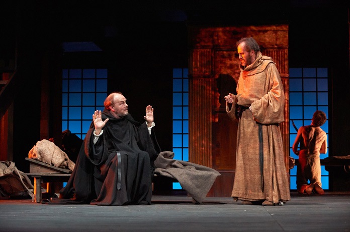 Il tutto legato dalla voce narrante di uno straordinario Luigi Diberti, il vecchio Adso. Ed è proprio lo sdoppiamento di questo personaggio, uno degli aspetti più seducenti dello spettacolo. Per dirla alla Eco “Adso racconta a ottant’anni quello che ha visto a diciotto. Chi parla, l’Adso diciottenne o l’Adso ottantenne”? Entrambi, naturalmente, ma la bravura sta nell’aver saputo mettere in scena Adso vecchio che ragiona su ciò che ricorda di aver visto e sentito come Adso giovane, in un susseguirsi di scene spedite, a tratti spettacolari.