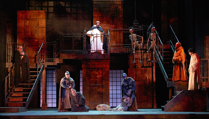 In scena anche Eugenio Allegri, Giulio Baraldi, Marco Gobetti, Bob Marchese, Daniele Marmi, Mauro Parrinello, Franco Ravera e Marco Zannoni. La fantasia dei costumi di Silvia Aymonino incontra dei limiti, funzionali tuttavia alla pacata regia di Muscato, che le concede un contrasto importante solo nella carrellata tra porporati e francescani, scansione temporale di effetto per richiamare l’atmosfera inquietante del XIV secolo.