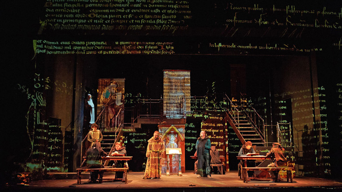 Con suggestioni efficaci e minimaliste la scenografia di Margherita Palli (palestra Ronconi) lega l’intensità della trama all’ingresso in scena di pochi oggetti essenziali, come pergamene e codici miniati. Grazie alle luci ed al loro gioco, Alessandro Verazzi dispiega le diverse anime dei luoghi dell’azione, sollevando polvere ed ombre nella labirintica biblioteca, mentre vetrate, rosoni e capitelli immergono la sala in una sacralità corale, servendosi di una cascata di teschi per la riproduzione dell’ossario.