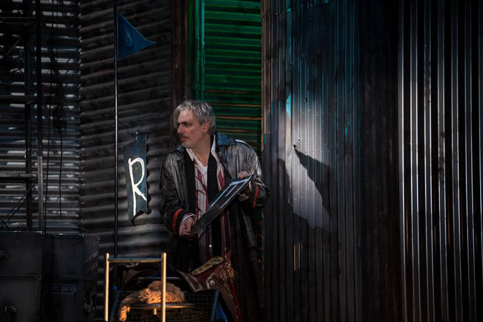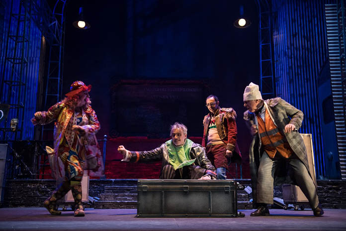 Ah, chissà come reagirebbe Miguel de Cervantes se sapesse di un suo bisbisnipote che si aggira di notte per una Napoli buia e spettrale, (re)incarnando tra le contraddizioni della modernità un Don Chisciotte malinconico e dotto, cercando di guadare immaginari laghi d’ombra e menzogna, evitando di bagnarsi e contaminarsi stando ben attento a porre i piedi su libri affioranti, dalle Critiche di Kant ai Mondi di Bruno, solida terra da contrapporre a liquide insidie. Perché questo Quijote partenopeo di Circus don Chisciotte, figlio di Ruggero Cappuccio che lo interpreta in questi giorni qui al San Ferdinando di Napoli, sposa la modalità più squisitamente italica d’interpretazione del personaggio, quella, cioè, di puro cavaliere pronto a combattere ogni possibile abuso e ingiustizia: non a caso il nostro combatterà pure, com’è d’obbligo, contro moderni mulini a vento (famigerate pale eoliche) che cercano di “condizionare pure l’aria”. Del resto, non è forse il don Chisciotte una tipica opera-specchio, in cui ognuno riuscirà a scorgere, alla fine, l’anima sua, o il momento particolare che quella sta vivendo in questo preciso momento, giocando con le ombre, traccheggiando con le luci, come il protagonista con i titoli dei libri, citati a piene mani dall’autore come i pesci e i favolosi – e numerosi – abitanti marini nella canzone de Lo guarracino, senz’altro ordine apparente che la rima e l’assonanza?
