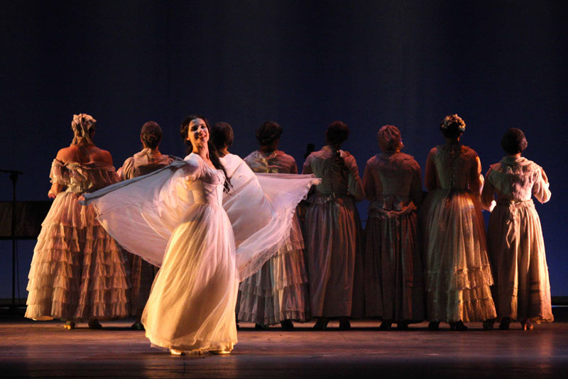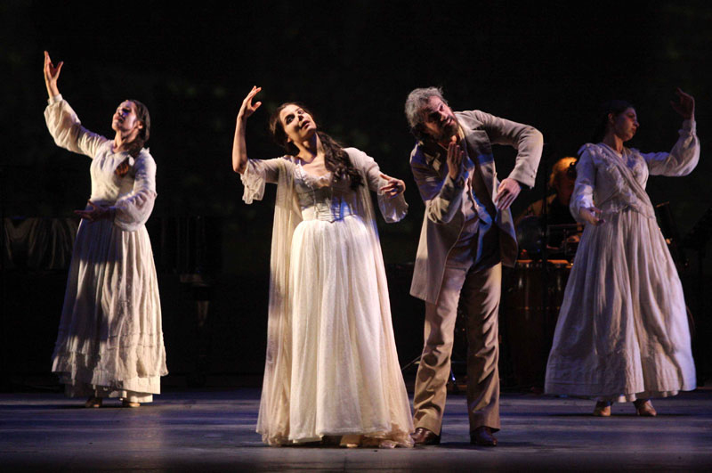 Per dar vita a una tale ambizione Cappuccio mette in scena una schiera di donne vestite di bianco e dalla pelle diafana, morte da secoli, spiriti ormai, che abitarono un tempo lontano nel palazzo di Fabrizio, Principe di Salina (protagonista per l’appunto del Gattopardo), ruolo affidato a Claudio Di Palma, anch’egli vestito di bianco; accanto a loro c’è Padre Pirrone, prete di corte, interpretato dal napoletano Ciro Damiano, l’unico con abiti neri.