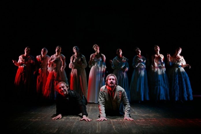 Poiché però questo oratorio è profano, e il testo non è stato ancora abbastanza strapazzato forse, il regista inserisce un altro elemento frastornante ovvero che ogni attore riveste più di un ruolo e allora Di Palma è anche Tancredi, nipote di Fabrizio; Damiano oltre ad essere il prete è anche Don Calogero, atavico nemico del Principe e le donne, nove per l’esattezza, sono sia serve, cameriere, o prostitute sia principesse, contesse, figlie, spose, madri e amanti di Fabrizio e Tancredi.