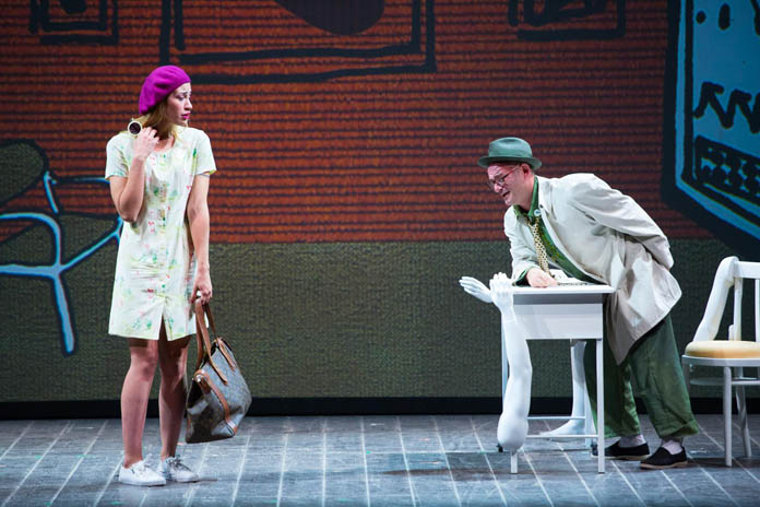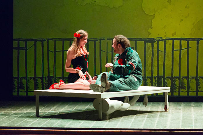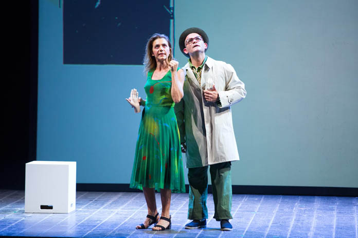 Moro è un giovanottone cresciuto a pane e ulivi in qualche posto laggiù al sud: sul finire degli anni sessanta lo troviamo – ha già indosso la tuta blu da operaio, non la lascerà per tutta la rappresentazione – alla stazioncina del paese, accompagnato dalla madre vedova. Come diceva una canzone di quegli anni, Moro sale sul treno del sud: sudore e mille valigie, occhi neri di gelosia, senza amore è più dura la fatica, ma la notte è un sogno sempre uguale. Va a Milano a lavorare, la madre nel salutarlo gli mette in valigia un paio di mutande rosse ricamate: dovrà donarle alla donna che amerà, come pegno d’amore… e qui già comprendi l’andazzo, perché, al di là delle belle proiezioni moderatamente animate che vivacizzano la bella scena disegnata da Lino Fiorito e le luci ammiccanti e nostalgiche di Pasquale Mari, puoi scordarti Cipro e l’orgoglio musulmano, il fazzoletto e il salice, Otello è solo un pretesto, lo scheletro, l’ossatura della storia che si racconta, rivestita dei luoghi, degli argomenti, della mentalità di quegli anni filtrati attraverso quella particolare cinematografia che fu la commedia scollacciata e sgangherata di quel periodo, dall’andamento incredibile e sconclusionato come le storie che in quegli anni – peraltro tragici – si raccontavano al cinema.