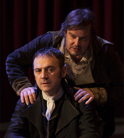 Complice e amico prima, rivale e nemico in seguito di Robespierre/Pierobon, votato al contrario alla virtù, alla devozione alla rivoluzione e al Terrore, il Danton/Battiston nelle tre ore e mezza di spettacolo agisce, reagisce e subisce il suo destino. Anche la Morte è protagonista dello spettacolo, evocata, corteggiata e affrontata con stile e rassegnazione dai 4 ‘dantoniani’ (Danton stesso, Desmoulins, Philippeaux e Lacroix).