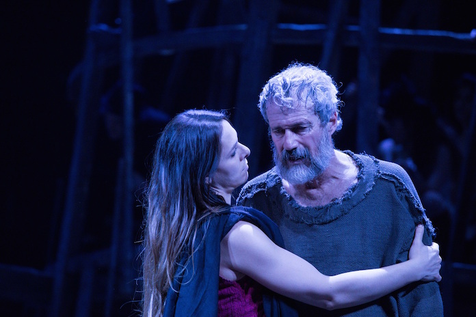 La messa in scena di questo testo di Sofocle che appartiene al patrimonio dell’umanità, ma che per l’occasione è stato riscritto da Ruggero Cappuccio, è stata affidata al regista Rimas Tuminas, lituano come Nekrosius, che ha accettato di prendere in eredità quel progetto – per il quale Nekrosius aveva già svolto a Napoli due workshop con attori italiani all’interno del Teatro Festival – “ripartendo in maniera del tutto nuova e originale”. Nuova e originale come la riscrittura di Cappuccio che, pur seguendo fedelmente la vicenda della tragedia, il suo inesorabile avvilupparsi intorno al protagonista, racconto del dolore e del potere perduto, di quel passato esercizio del potere che è la vera colpa del protagonista, riesce tuttavia a risuonare come del tutto inedita al pubblico – estivo e lievemente disimpegnato ed effimero – che affolla le gradinate del Teatro di Pompei, che tuttavia segue con interesse e concentrazione la vicenda.