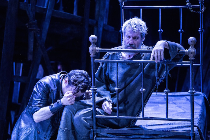 Ma ci sono altri tre letti in scena, utilizzati dal coro, sistemati uno accanto all’altro, come a formare una sorta di paesano e rustico palcoscenico: trova patria e spazio vitale qui, su questo raffazzonato teatro di strada, da parte di un coro d’improvvisati(?) teatranti, quello che mi è sembrato l’appassionato omaggio che l’Autore e il Regista hanno inteso dedicare all’arte del recitare, alla grande tragedia classica e a tutto quanto è avvenuto dopo, in un filo rosso che da Sofocle giunge fino a Nekrosius (e dunque, non pura formalità appare, a ben vedere, il tributo alla sua memoria che chiude, sull’alta torre nera, come abbiamo detto, la rappresentazione).