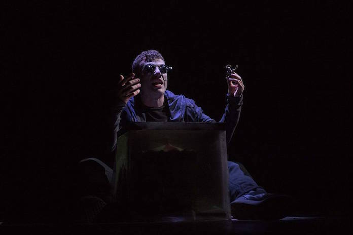 Quando il sipario si alza (veramente si alza solo a metà, come rivelasse una estrema, strenua riluttanza, o dovesse vincere una pesante inerzia, oppure chissà qual incomprensibile timore), quando il sipario si alza a metà, non percepisci subito le coordinate del mondo in cui sei capitato: sul fondo ovattati tramezzi d’un pallido grigio offrono opaco e traslucido limite ad una luce diafana che attraversa il palcoscenico; in primo piano, sulla destra, un mucchio di sabbia bianca e leggera, sulla sinistra, un ragazzo seduto a terra, con davanti una cassetta, e con un buffo paio di occhiali luminosi comincia a parlare… è una lingua, la sua, che ti riporta alle parlate del nostro Sud, colorata tuttavia della vernice arcaica che evita di troncar le parole, ma ben presto t’accorgi che, nonostante l’apparenza, invece è nuova, quella lingua, costruita abilmente ex novo, con un effetto che, straniante all’inizio, ben presto diventa piacevole e naturale, pur mantenendo una sorta di ritmo poetico e musicale, come dev’essere una lingua vera, segno evidente che l’artificio è riuscito.