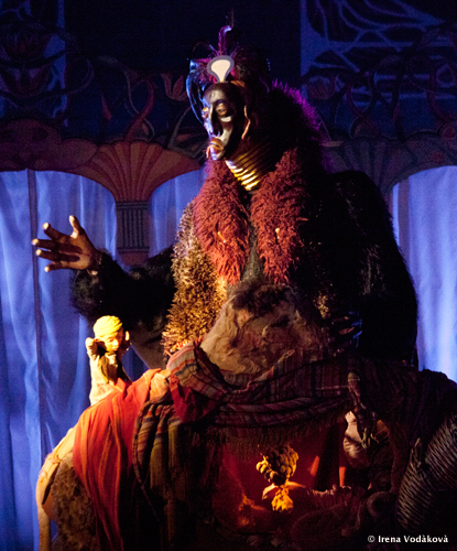 La risonanza della scenografia, evocante il mondo arabo e ancestrale de Le mille e una notte – di colori soffusi, lampade, grate e finestre – si scontra con le creature costruite dalla mente visionaria dei Forman. Il mago gigante, mostruoso, dalla maschera paurosa, che spaventa ed esalta i bambini, è il simbolo del terrore che suscita una fiaba, della tipica immersione in un’incredulità che è anche catartica.