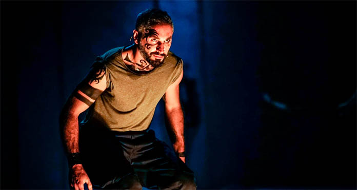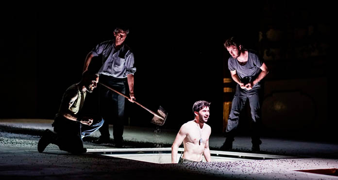 In questa rivisitazione/ricombinazione del Giulio Cesare di Shakespeare, Fabrizio Sinisi s’immagina un mondo già privo del protagonista, ma pure di molti comprimari: restano, ad abitare questo Giulio Cesare sospeso nella gran notte della Storia, solo Bruto (Isacco Venturini), Cassio (Daniele Russo) e Casca (Nicola Ciaffoni), che vengono sistemati dal regista Andrea De Rosa ciascuno nelle tre buche piccole di cui è provvisto il gran palcoscenico che qui al Bellini di Napoli, per la rassegna dedicata al Teatro Shakespeariano, il Glob(e) al Shakespeare, mentre nella grande, al centro, un uomo vestito di nero, che poi si rivelerà essere Antonio (Rosario Tedesco), inesausto spala una gran massa di terra, almeno per larga parte della pièce, all’interno della buca, verso quel mondo sotterraneo che probabilmente è il vero protagonista della Storia, di questa storia. Estremamente caratterizzati, i tre cospiratori non sono tutti uguali: Bruto è l’ansia, l’angoscia che corrode, l’intellettuale che sente gravare su di sé il dubbio e il giudizio della Storia, perché se Cesare andava fermato, non è detto che con la sua uccisione il male sia vinto: era Cesare che generava il male, la tirannia, oppure il contrario, Cesare altro non era che espressione del momento storico, della particolare esigenza e condizione che, in qualche modo, lo “usava”, incarnandosi in quel particolare Corpo, ma pronta a reincarnarsi in un altro, purché disposto, in cambio del potere, a lasciarsi usare? Casca è il topo che abita i bassifondi della Storia, che trova nell’eliminazione del potente di turno l’ebrezza dell’unico momento di problematica gloria della vita sua, senza porsi altro problema che la paura di possibili conseguenze personali al suo gesto, una volta tanto, irreparabile. Poi c’è Cassio. Cassio l’anima nera. Cassio il rivoluzionario. Cassio dalle parole d’ordine, gli slogan demagogici che gareggiano con quelli del nemico, Cassio il puro, segno e visibile sacramento dei tanti incorruttibili uomini onesti della storia.