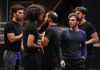 Infine Antonio, che fa presto a reinterpretare il potere, nella rivisitazione della sua celebre orazione, obliqua, ambigua, come gli “uomini d’onore” cui si riferisce: non fa in tempo a finirla che già si ritrova nei panni del possibile tiranno, in una condizione di perfetta simbiosi con il dominio e la potenza. Sappiamo tutti come andrà a finire, ma intanto l’appuntamento è a Filippi, nella battaglia che d’un tratto diventa archetipo di tutte le guerre della storia, dei soldati che marciano convinti innestando il microfono sull’asta come la baionetta sul fucile, battaglia di parole, battaglia che – pure – si svolge in un teatro (non dimenticarlo), è messa in scena, è, più modernamente, televisione, distruzione/distrazione di massa, e che nel gran rumore dei suoni e della parole finisce nel frantumarsi delle speranze di Bruto, nell’agonia dell’odio di Casca, nel morire dei progetti di Cassio. Il sottosuolo, sempre attraverso le tre botole del palcoscenico, è in qualche modo protagonista pure del secondo “pezzo” teatrale, messo in scena a seguire il Giulio Cesare – ricordiamo come, nella particolare formula adottata dalla rassegna Glob(e) al Shakespeare, siano ogni sera abbinate una commedia e una tragedia – Una commedia di errori, nella riscrittura di Marina Dammacco, Emanuele Valenti, Gianni Vastarella per Punta Corsara.