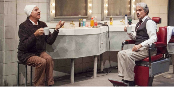 “Night and day” notte e giorno, non è solo il brano intro dello spettacolo, ma la vita sempre ne “Il sottoscala(Staircase)” di “Quei due” barbieri. Da un lato il salone arredato con specchi come fossero di camerino con luci a faretti tutti intorno e dall’altro il sottoscala è la cucina, quindi la porta a sinistra accede all’appartamento di Harry e Charlie e sulla scala vive la mamma del primo. Bella ed efficace scenografia disegnata da Massimo Bellando Randone e al centro della scena la porta della bottega.