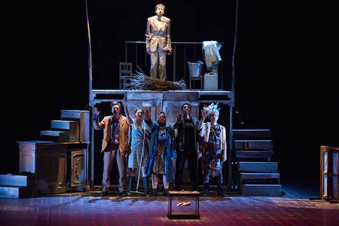 Una scrittura dai molteplici riferimenti, quella di Emanuele Valenti e Armando Pirozzi, che spesso trova proprio nell’ampia eterogeneità la ragion prima della validità espressiva del testo, riesce, grazie anche alla scena intrigante di Tiziano Fario, a rendere ragione, forse, della perenne stasi napoletana, della maledizione che da sempre grava sulle mille e mille masaniellate che si sono succedute nel corso della storia, perennemente “in bilico”, come questa commedia, tra alto e basso, destra e sinistra, luce e tenebre, ragione e superstizione, ateismo e fede.