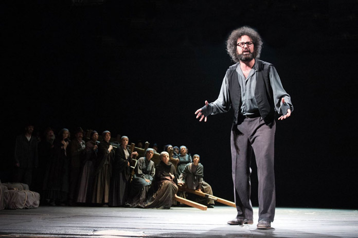Cristicchi è il menestrello di questa vicenda. Alternando una varietà di personaggi, servendosi soltanto della sua straordinaria voce e della sua raffinata capacità attoriale, riporta sulla scena tutti i protagonisti di questa “strana storia”. Insieme a lui sul palco, un carro di fine Ottocento che all’occorrenza è mezzo di trasporto, trono di Pio IX, chiesa in costruzione e quant’altro. Il menestrello o cantattore o semplicemente attore, impossibile circoscriverlo a una definizione, non si ferma un istante, smontando e rimontando questo carro che è vivo e coprotagonista insieme a lui della scena. La regia di Antonio Calenda è impeccabile, dirige con mano sicura il suo attore, costruendogli attorno, complice questa particolare scelta scenografica, il suo mondo. Un binomio assolutamente riuscito quello Cristicchi – Calenda, uno spettacolo coinvolgente, privo di sbavature, tempi morti e leziosismi; per nulla scalfito dal raccontare una storia così poco teatrale.
