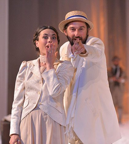 Un giardino pallido, bianco come gli abiti dei suoi abitanti e trasparente come le tende chiare del fondale sul quale si annebbiano. Cammina leggero Roberto Bacci, lungo una regia candida, senza particolari slanci emozionali, che punta sul ricondurre il testo di Cechov a “casa”, incontro ad una commedia dal sapore agrodolce, dove il dramma risulta meno amaro, attutito dal riso e dalla spensieratezza. Una scelta che conduce da un lato ad alleggerire un’opera articolata e interiore, dall’altro alla perdita parziale di quella complessità e profondità tipica dei personaggi cechoviani. Cosa che al pubblico non sembra molto interessare, visto i calorosi applausi, dovuti anche alla presenza in sala della comunità romena che avrà potuto apprezzare appieno lo spettacolo (in romeno con sovratitoli in italiano).