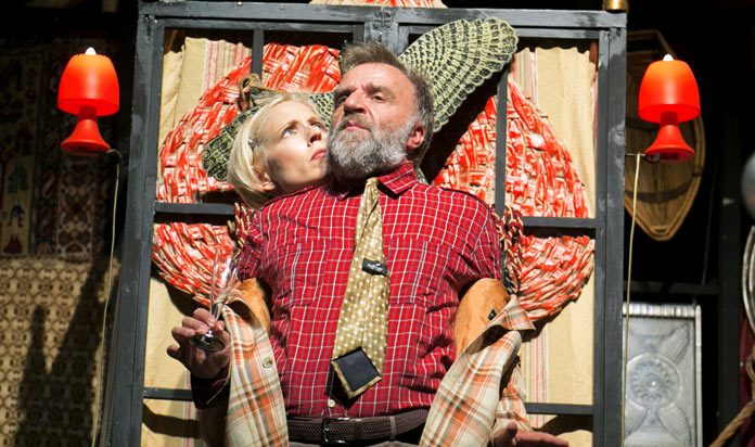 Nell’arena del Teatro Golden all’altezza del palco abbastanza ridotta nelle possibilità realistiche di creare due piani, si contrappone la bravura dello scenografo Matteo Soltanto nel disegnare un livello superiore dalle ambientazioni multietniche e uno inferiore come una bottega d’artista, con tele, canape, lini, mascheroni, marchingeni, e pupazzi forieri di accattivante attrattiva, perfettamente in linea con gli interessi dei due protagonisti. Scale, porte, cunicoli e separè rendono perfettamente la profondità prospettica e l’effetto richiesti dal contesto drammaturgico.