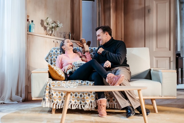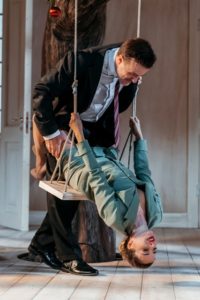 La complessità di Nora emerge anche attraverso il rapporto con gli altri personaggi: il dottor Rank, il migliore amico della famiglia prossimo alla morte per una malattia terminale, interpretato da Fulvio Pepe con una cinica ironia che strappa risate a scena aperta, il procuratore legale Nils Krogstad, lo strozzino disperato che tormenta Nora, ben interpretato da Andrea Di Casa con i suoi tratti cuoi privi di empatia, la signora Linde, la donna amica di famiglia incolore che però sarà il perno degli avvenimenti cruciali della storia, ne veste i panni l’equilibrata Eva Cambiale e in ultimo, ma non meno importante, la bambinaia e domestica Anne Marie, in una convincente Orietta Notari, che per ottemperare al ruolo di angelo del focolare domestico ha dovuto rinunciare alla propria famiglia. La scenografia firmata da Laura Benzi è un ambiente borghese contemporaneo curato nei dettagli, al cui centro troneggia un elemento surreale: una quercia addobbata con le luci di Natale che simboleggia l’albero della vita e della conoscenza del bene e del male, da cui si dondola ogni tanto sull’altalena Nora, moderna Eva che ha commesso una colpa che la logica maschilenon gli perdonerà: sovvertire regole sociali claustrofobiche. L’uso sapiente delle luci, curate da Pasquale Mari, regala alla scena atmosfere diverse, cangianti e in sintonia con gli stati d’animo dei personaggi.