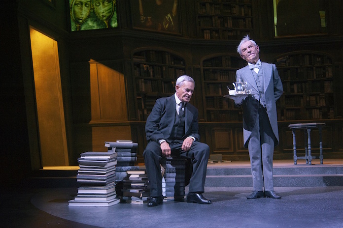 E altro ancora, poi, e di diverso genere e spessore e valore, è ciò che percepirà lo sguardo di chi, al di là della quarta parete, vedrà l’opera, ciò che coglierà, percepirà, l’emozione suscitata, il pensiero portato alla luce grazie a quel gesto, a quella parola: tutto questo, la percezione, cioè, dell’ultimo fruitore, assomiglierà a quanto concepito come il fenotipo al genotipo, come cioè carne ossa e sangue al dna che a quella stessa stessa carne ossa e sangue sottende, potendo legittimamente, dunque, discostarsi da quella in modo anche sensibile. Così, spente le luci in platea del gran teatro, la scena, disegnata, come i costumi, da Marta Crisolini Malatesta, mostra una grande biblioteca: Prospero (che è un sempre stupefacente Eros Pagni), si sa, è uno studioso, lui stesso confesserà di preferire di gran lunga, anche quand’era Duca di Milano, lo studio agli affari di stato, anzi, probabilmente d’aver perso il potere proprio a causa del suo amore per i libri.