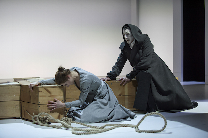 Se ne accorgerà Margherita, che ha carne e sangue di una struggente, a tratti commovente nella sua disarmante ma nobilissima semplicità, Leda Kreider, se ne accorgerà fin dall’inizio, nel giardino di Marta (Valentina Elia) o mentre lavora all’arcolaio, quando riconoscerà l’amor nascente per Faust alle note di Schubert cantato a cappella, metamorfosi dell’impossibile suono, liquido, evanescente, purissimo nella sua trama esposta, vivisezionata e (ri)composta come tutte le musiche di questa vera e propria tragedia in musica, smontate e rimontate con la curiosità del bambino che fa a pezzi la sveglia per capirne il funzionamento.