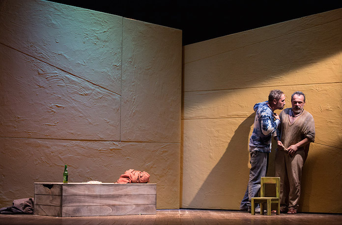 In un luogo fuori dal tempo e dalla storia, di cui nulla sappiamo, se non che è chiuso da mura all’apparenza argillose e affocate, di cui intravediamo solo un parziale incrociarsi, e che poi sapremo non possedere né porte né finestre – un luogo dell’anima, dunque, o della mente – e da cui è impossibile entrare e uscire, sono due uomini. In apparenza sono lì da un tempo indefinito, noi che siamo entrati nella sala semibuia li abbiamo trovati già lì, uno è sveglio, siede con una coperta addosso su una piccola sedia, l’altro è steso su una cassa e dorme, entrambi sono vestiti in modo molto dimesso, anzi diremmo trasandato e poco pulito, certamente quelli che hanno addosso sono gli unici vestiti che possiedono. Sono, insomma, quei due uomini, in tutta evidenza, due scarti, espressione vivente dell’estremo esito della società dei consumi, che alla fine, dopo aver considerato ogni prodotto come consumabile in un lasso di tempo ben definito, trasformandolo definitivamente in rifiuto che andrà ad ingrossare a dismisura ciclopiche discariche, ha considerato scartabile pure l’essere umano che per qualche motivo non sia più utilizzabile, escludendolo anche dalle periferie e dai bassifondi, bandendolo definitivamente dal consorzio umano, minandone l’appartenenza alla società civile, rifiuto, avanzo, scarto, appunto.