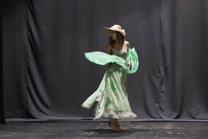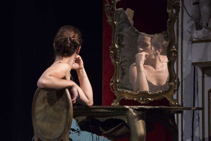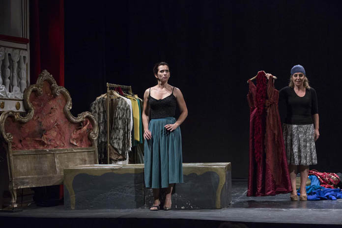 Sceglie, il regista, di riscrivere il testo in napoletano, adattando però, almeno così m’è sembrato – e così in verità risulta dalla scheda dello spettacolo – la classica traduzione di Giorgio Caproni, rinunciando alla diretta trasposizione dal francese; ambienta poi l’intera vicenda in un teatro, durante le prove de Le serve di Genet, decidendo di raddoppiare, dunque, inutilmente, la metateatralità della vicenda; è costretto, anzi, per questo, a inventarsi altri personaggi, altre presenze: una voce fuori campo, quella di un presunto regista che ci è sembrato, in verità, molto poco appassionato al suo lavoro, e quella di un attrezzista/fisarmonicista che, oltre a portare fisicamente sul palco un po’ di mobilio a popolare una scena inizialmente deserta, accenna di tanto in tanto motivi francesi e napoletani al suo strumento; apporta alcune modifiche sostanziali alla drammaturgia dell’opera, sopprimendo di fatto la parte della signora – l’attrice che la interpreta compare solo all’inizio, in un improvvisato prologo in platea – facendola eliminare di nascosto dalle altre due, se ben si comprende, per gelosia di mestiere. Questo costringe anche ad una sostanziale modifica della seconda parte della pièce, perché la parte della padrona è sempre “recitata” da una delle due serve, e perché l’omicidio della signora diventa poi il reale motivo del suicidio finale.