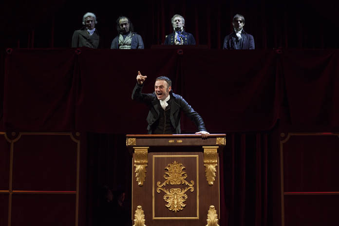 Così i numerosi sipari che si aprono e si chiudono (a volte con sinistro rumor di mannaia che cade) non possono non ricordare il teatro e, dunque, la rappresentazione della realtà che sul palcoscenico si va dipanando: metateatralità nel suo significato primigenio, di meditazione sulle finzioni che avvengono nel mondo reale, non verità, ma specchio di essa, disvelarsi di tracce di quella nei pensieri e nelle azioni che sul palco si rappresentano. Salvo, poi, a rendere ancor più scoperto il trucco, più stringente il disvelamento dei meccanismi del nostro vivere, allargare lo sguardo d’improvviso, uscire dal teatro oltre i suoi naturali confini, scendere in platea – vecchio trucco ma che quando applicato correttamente e con maestria, come in questo caso, conserva intatto il suo sapore di autenticità – accendere le luci in sala e trasportarti nel bel mezzo d’una strada di Parigi, pur se questi cittadini hanno spesso l’accento di Partenope, come avviene tra il primo e il secondo atto, in una promenade che diventa ben oliata macchina del tempo. Lo stesso meccanismo è alla base del discorso di Robespierre e Saint-Just al Consiglio: la scena diventa proprio il palco degli oratori, tu in platea entri a far parte dell’Assemblea, le urla, gli applausi e le voci provengono da dietro, da destra, da sinistra, sei al centro dei processi della Storia.