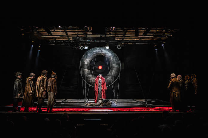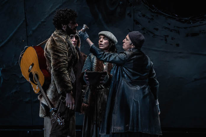 La scena ideata da Luigi Ferrigno, per altri versi buia e anonima come dev’essere, conducendoci in un distopico luogo senza misura e senza età, colpisce per la presenza, sul fondo, d’una sorta di telone oscuro ma non opaco, che in parte, dunque, e approssimativamente, riflette la luce e il mondo sulla sua ombrosa superficie, (ri)creando uno spazio pallido e confuso, ma che porta, in alto, al centro, ben evidente sopra le vicende umane, uno slabbrato ma compiutamente rotondo foro, come lo squarcio lasciato dal poderoso proiettile d’una bombarda. Attraverso questo foro s’intravede – alla fine dello spettacolo la tela cala completamente a terra – una sorta di occhio, la cui pupilla, all’inizio di ogni scena, s’illumina di rosso intermittente, mentre una voce fuori scena legge le didascalie di Brecht che introducono allo svolgimento della vicenda: “voce accecante della Storia”, dice Coletta.