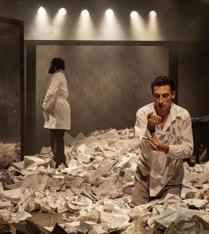 La regia è davvero interessante, le scene sono ben fatte e molto dinamiche, con un uso delle luci appropriato e mai banale. Nella scena del manicomio, la scenografia arretra e il pavimento si ricopre di montagne di ritagli di giornale, gli stessi che Poprishchin strappava e censurava nel suo lavoro al ministero, ormai è finito nell’oblio, la società lo cestina e lo censura. La pecca principale dello spettacolo purtroppo è l’attore protagonista, che inizia lo spettacolo esaurendo già quell’energia che dovrebbe esser conservata invece per l’ultima parte. Le battute sono coerenti alla non pazzia iniziale, ma emotivamente lo vediamo già carico: questo sporca il finale, rovinando il crescendo.