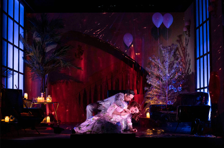 Lo spettatore non ci fa subito caso ma nell’esplosione di colori e decorazioni presenti sulla scena, realizzata con maestria dal team del Franco Parenti, c’è un terzo personaggio che legge il giornale seduto sul divano, invisibile a tutti, anche a Mrs Fairytale.