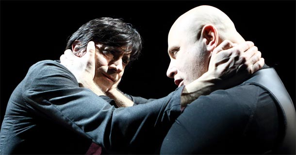 [rating=5] Un’opera mastodontica e potente, l’Otello di Lo Cascio, di cui è autore e regista, oltre che attore. Un lavoro che guarda all’essenza ma anche alla profondità, il suo, mutuato dall’analisi del testo shakespeariano con il coraggio di scelte ben precise, che danno un taglio molto personale alla materia. Il tema della gelosia è il pernio di una costruzione in cui Otello non è personificazione mitica e distante di questo sentimento ma persona/personaggio indagato nelle sue fragilità. Lo Cascio distilla il dramma; il suo approfondito studio sul testo lo portano a far vivere la vicenda dai tre personaggi principali: Otello, Iago, Desdemona. Tragedia raccontata agli spettatori da un quarto personaggio in scena, di invenzione dell’autore, il soldato (magnificamente interpretato da Giovanni Calcagno), moderno Virgilio che ci traghetta e guida tra gli abissi delle passioni di Otello e l’infittirsi della trama. Scarnificata e ridotta nella sua essenza, essa infatti non segue l’ordine cronologico del Bardo, rispondendo coi suoi salti temporali, opportunamente, alla scelta di far introdurre la storia di un umanissimo Otello dal narratore, il soldato appunto, spinto a farsi intermediario dei fatti per il pubblico, da pietas amicale e dal desiderio di rendere giustizia alla storia del Moro.