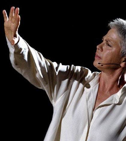Quando il buio cala in sala, le voci del pubblico scemano, il sipario si apre e un suono violento di corde d’arpa riecheggia nel palcoscenico del Metastasio e fa da tappeto sonoro all’ingresso di Ottavia Piccolo, completamente vestita di bianco.