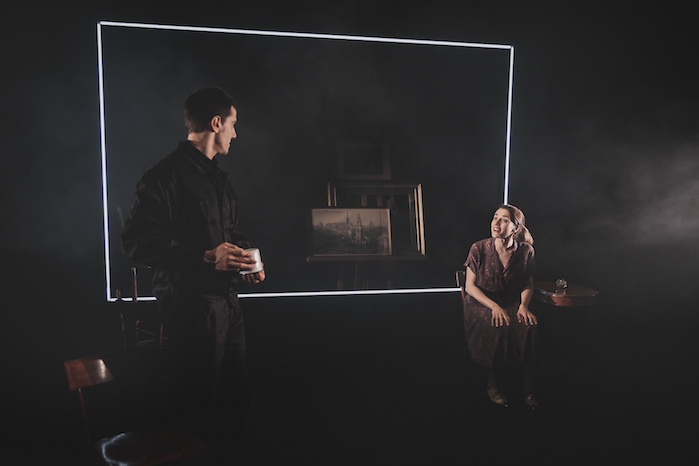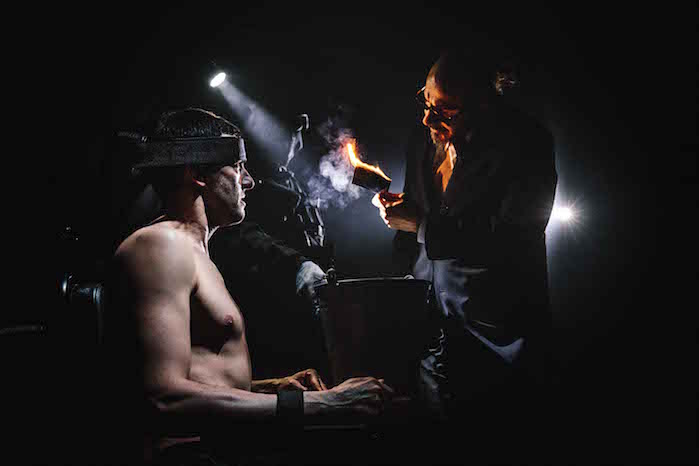 Il primo è sempre acceso, più piccolo, sul fondo del palcoscenico: ad un tempo, è l’occhio del Grande Fratello – compare, di tanto in tanto, non sapresti dire se umano o virtuale, a ricordarti lo sguardo posato sui protagonisti che agitano la scena – ma anche luogo dove avvengono episodi particolari della vicenda – la bottega della robivecchi che poi lo tradirà (Eleonora Giovanardi), la stazione di polizia subito dopo l’arresto dove incontrerà il collega Parsons (Andrea Volpetti) denunciato dalla figlia bambina – e poi, sorprendentemente, scientemente, significativamente, specchio in cui, a tratti, per sapiente inclinazione delle luci (di Orlando Bolognesi), si riflettono le ansie degli uomini, ma anche le speranze o le contraddizioni, come alla fine della scena della tortura, quando alla figura del protagonista riflessa dallo specchio, si sovrappone, dietro lo schermo, quella di Julia (Aurora Peres), perché il Grande Fratello, sembra suggerire il regista, non può esercitare alcun potere se non quello riflesso da noi stessi, emanato da noi, fermamente voluto e confermato da noi.