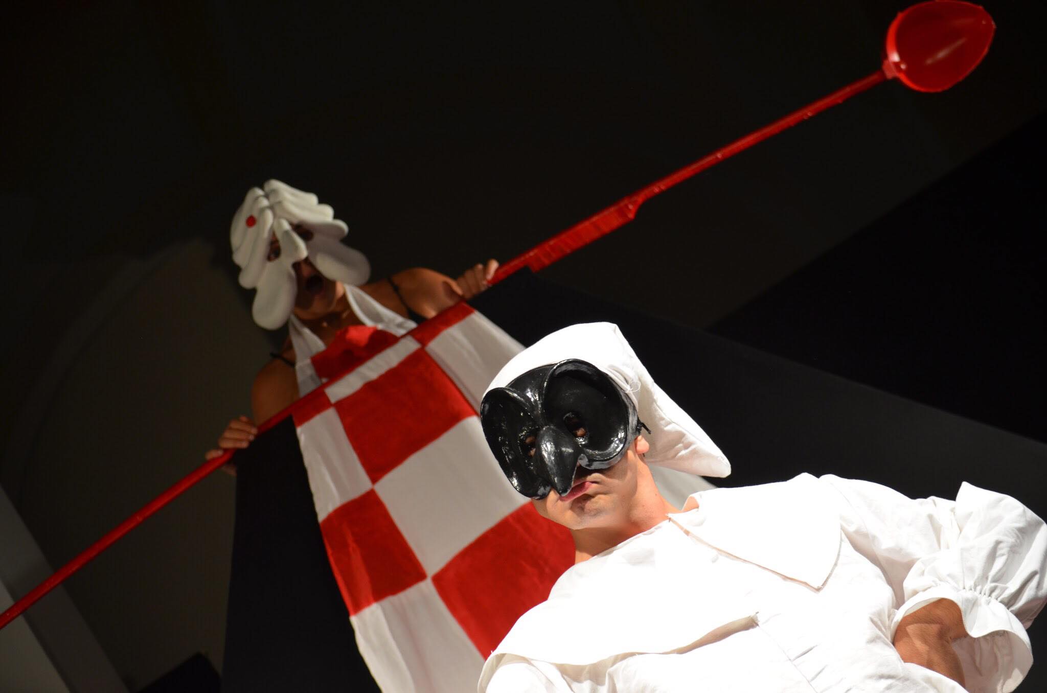 Paschitto gioca abilmente con la lingua, piegandola e distendendola a suo piacimento, un po’ come la scenografia che parte da un blocco nero quadrato e cambia diventando un vulcano, una tavola, una cattedra, il tutto puntellato di oggetti rossi e dalle maschere bellissime ad opera di Martina D’Ascoli che gli attori indossano senza mai mostrarsi in volto (ad eccezion fatta per Felice Sciociamocca che, da narratore/guida, appare in scena così com’è, a viso scoperto).