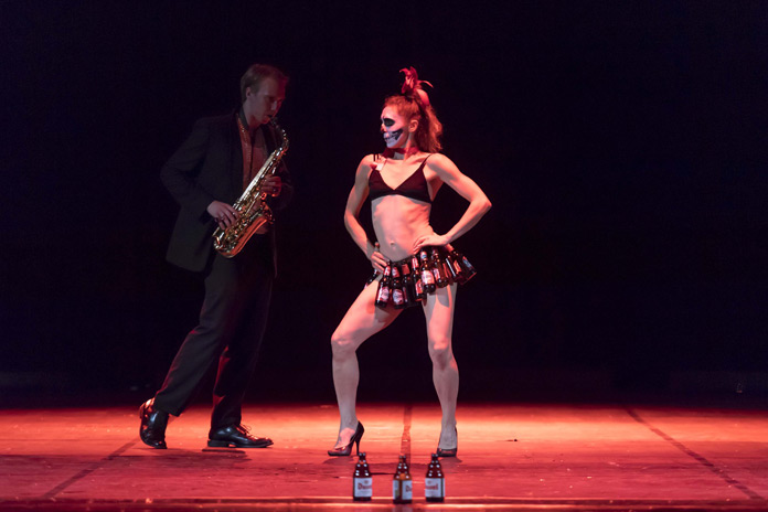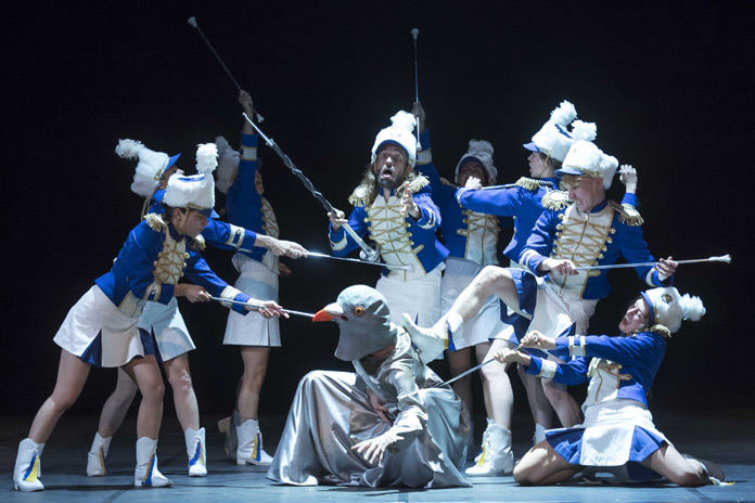 E assurdo è tutto quello che accade in scena da questo momento in poi, circa venti attori/ballerini portano sul palco le contraddizioni di un paese in cui è permesso fare tutto finché non si è osservati da nessuno; una piccola nazione che il plurilinguismo ha reso una Babele; uno stato in cui, a dispetto dell’idea di rigidità e rispetto delle regole che viene percepito dall’esterno, regna in realtà il caos di un carnevale perenne.