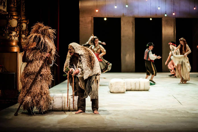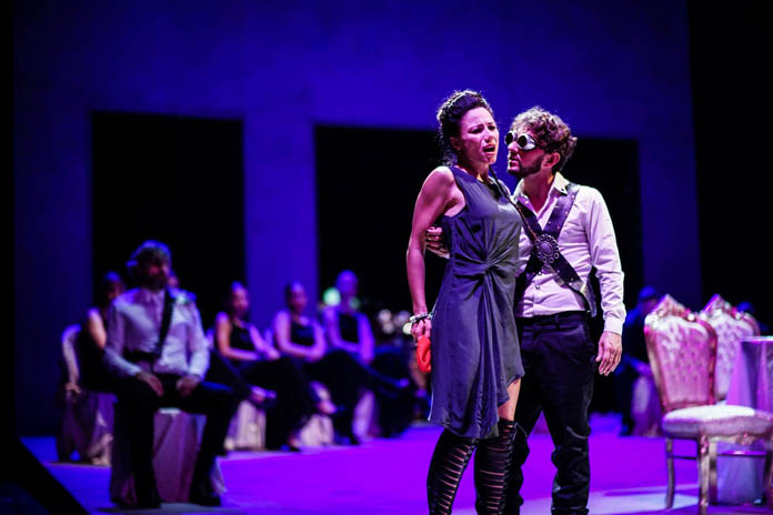 Affida, Francesco Saponaro, alle note dell’Overture dei Vespri siciliani l’incipit della sua messa in scena: risuona elegante, accompagnando l’entrata dei principi, sottolineandone l’attuale felicità ma, insieme, l’oscuro presagio di quanto di lì a poco succederà. La scelta è felicissima, perché non si tratta solo di una mera notazione che riguardi il luogo ove la vicenda si svolge – una Sicilia oscura e piena d’ambigue malìe – e neppur solo riferimento al secolo elegante e nobile in cui vien trasmutata la vicenda, l’Ottocento in finanziera e mantello che fu dei Principi Salina, ma proprio perché a questo brano Verdi affida, come dice Michele Girardi, “il suo punto di vista sulla vicenda, dominata da una sorte tragica che colpisce un’utopia di pace, annientata da una violenza inutile”, che, non è un caso, è esattamente ciò che accade in questa complessa vicenda, compresi i figli che riconoscono i padri al di là del tempo e del dolore. La Sicilia e la Boemia sono più o meno equidistanti da Londra, e viste da laggiù le due regione europee possono benissimo assumere forma e sostanza di luoghi fantastici ove dominino stilizzati e raffinati modelli cortesi nell’una, finendo per guastar la ragione dell’amabile monarca che la regge, ovvero bucolica e più semplice vita campestre nell’altra, più adatta al fiorire d’un amore vero e sincero, che sarà quel che legherà i giovani figli dei due re, inconsapevoli di quanto accaduto sedici anni prima e che saneranno il vulnus dei padri; così, nella visione della riscrittura, la Sicilia diventa il regno descritto da Tomasi di Lampedusa, quasi fosse Leonte un don Fabrizio con cui, in verità, si trova a condividere l’autorità, la crudeltà, la carnalità, la fisica felicità, l’orgoglio di classe; la Boemia, sorprendentemente, un eterno Sud da Fontamara, coi cafoni poverelli privi d’ogni mezzo, tra povertà e ignoranza, per difendersi dalla vita e dalle prepotenze dei nobili che, come gli antichi dei, si travestono da contadini e pastori per carpirne la fiducia e tutelare i propri interessi. Bellissimi i costumi: in assenza pressocché totale di scene e fondali, l’attenzione si concentra sugli oggetti di scena e sui loro movimenti, per esempio sulla poltrona-trono su cui si concentra la luce del potere, o sulla clessidra simbolo del tempo che sana le ferite attraverso lo scorrere delle generazioni, o, ancora, sul gran fazzoletto bianco di Leonte, simbolo, insieme, della sua gelosia (e già si pensa all’Otello che verrà), della follia della notte della ragione, dell’ingiustizia che commetterà.