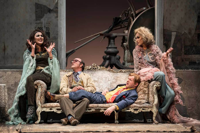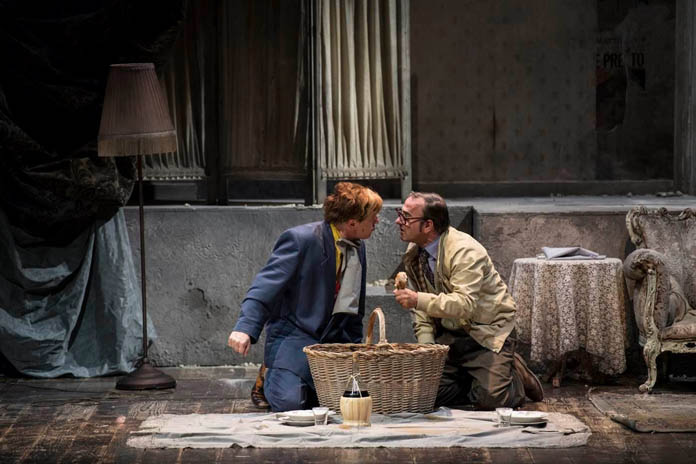 Così, all’aprirsi finalmente del sipario, la casa non è solo il polveroso tugurio dove s’affollano e s’affastellano mobili dal glorioso passato, dal decaduto presente e dall’incerto futuro, non è solo il loculo per ancor viventi che richiama l’alveare umano de La città involontaria della Ortese, ma anche spazio che il terremoto dell’ottanta ha scavato e insieme devastato, messo a nudo e sgretolato, scoperchiato come si fa quando con la pietra si disseppellisce il verminaio e si ha voglia subito di rimetterla a posto, per chiudere, occultare, restituire il caos al precario e incerto equilibrio che c’era “prima”. Muro sgretolato e incerto, in parte (ri)tappezzato dai giornali dell’epoca – Il Mattino del 26 novembre 1980, quello del “fate presto” a titoli cubitali, coperto parzialmente da una coeva copertina di Bolero film – si apre però in un vano, una porta che diresti aperta alla luce e all’aria libera, via d’uscita verso un diverso mondo e destino, ma che invece non è che l’accesso all’ingresso dell’appartamento, che Cicala e Scialò (Carmine Paternoster e Salvatore Striano) barricheranno, subito dopo essere entrati in casa, per impedire l’entrata agli uomini di mammà, intenzionati a vendicare l’infamità grazie alla quale i due sono usciti anzitempo di galera.
