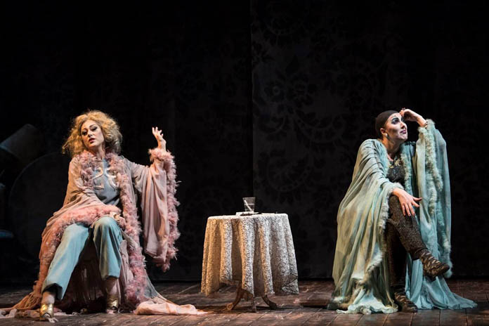 Comincia, Ragazze sole con qualche esperienza – in scena in questi giorni al Teatro San Ferdinando qui a Napoli, per l’accorta regia di Francesco Saponaro – a luci ancora accese in sala, con la voce di Grand Hotel che stenta a farsi sentire, canticchiando una canzonetta in voga negli anni ottanta, gareggiando con il chiacchiericcio del pubblico inavvertito che continua, zittito solo alla fine da qualcuno: in scena un oscuro velario permette, grazie a un lento e progressivo gioco di tenui e sapienti luci, d’intravedere, al di là di quello, un interno d’appartamento ancora indefinito nei suoi particolari ma che indovini essere un grande salotto con tanto di divano rococò, che dà su altri ambienti grazie anche a un gran varco praticabile al culmine di una breve scalinata; sul davanti, verso la platea, un prolungamento del palcoscenico, aggettante verso te che sei seduto sulla tua poltroncina rossa, ha il dichiarato scopo di rompere la quarta parete, di rendere te, proprio te, complice e partecipe dei fatti e dei misfatti: si siedono lì, prima che tutto cominci, praticamente di fronte a te, i due travestiti Bolero e Grand Hotel (rispettivamente Veronica Mazza e Lara Sansone in stato di grazia), quasi volessero farti partecipare al loro colorito e variegato ciarlare, voci dell’ancestrale ventre della città, dalle espressioni buie come il tempo ignoto che li ha un giorno generate, che il genio di Enzo Moscato sapientemente mescola a riesumazioni d’un passato più prossimo, che pure tu hai vissuto, riferimenti a volti e situazioni e persone che popolarono gli anni ottanta del secolo breve in cui fu scritto questo testo – Gabriella Farinon, Vermicino, Virna Lisi… – contaminazioni fatte del linguaggio falsopoetico da fotoromanzi che hanno sapore di profanazione e disgregazione ma che, pure, possiedono il potere inopinato e inatteso di riportarti alla mente sapori e odori che pensavi ormai smarriti, e poi, poi, espressioni che non diresti, che non penseresti mai ritrovare qui, sorprendenti come lo stupore che ti prende di fronte al manifestarsi geniale d’un idiot savant, brandelli di cultura forse raffazzonata sulle pagine della Settimana Enigmistica che di sicuro – più tardi ne avrai la prova – vien letta e consumata in quella casa, estremo sminuzzarsi d’un’erudizione disegualmente non formale e un po’ fatua.